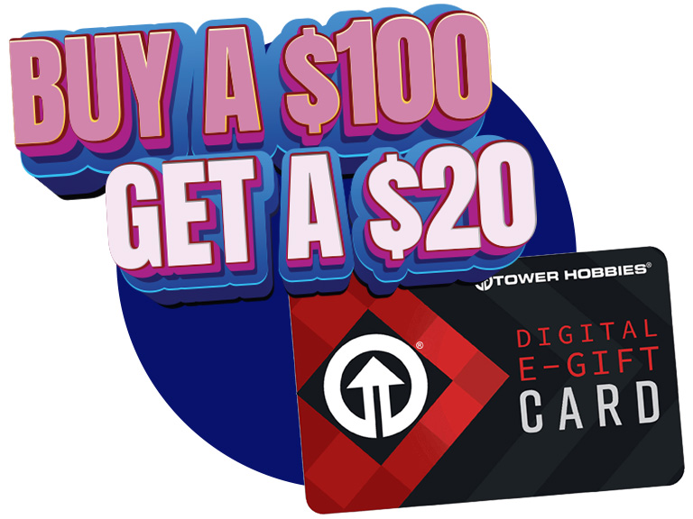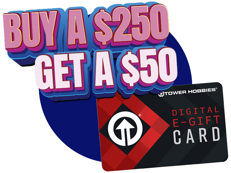 Terms: Expires February 8th, 2026 at 11:59 pm CT. No code needed. Automatically applied at checkout. The free eGift applies once per eligible gift card SKU (TOWGIFT050, TOWGIFT100, TOWGIFT250). Multiple eligible SKUs may be redeemed in the same checkout. This offer may be used in multiple separate checkouts. Cannot be combined with other promotions. Employees of Tower Hobbies, LLC. its affiliated companies, members of their immediate families and individuals living in the same households are not eligible to receive this discount. Not applicable to taxes or shipping fees. No adjustment of previous purchases. This promotion cannot be redeemed for cash or cash equivalent. Prices, availability, and specifications are subject to change without notice.