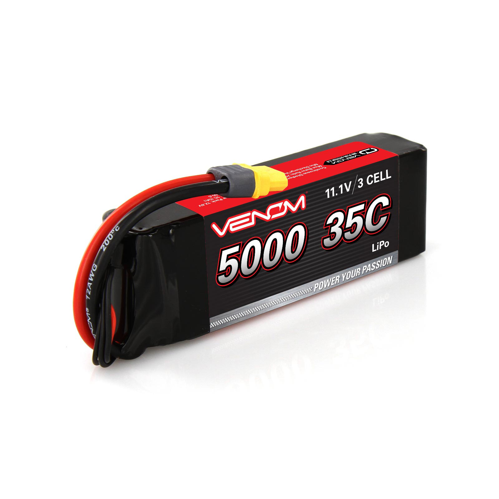 This Venom® 35C 3S 5000mAh 11.1V LiPo battery with UNI 2.0 is perfect for most 1/8 and smaller brushed RC boats, 2WD and 4WD brushless cars, monster trucks and buggies and is built with Venom® Flak Jacket metal plates for added protection and durability. Venom® DRIVE batteries now also include the Venom® Universal 2.0 Plug System for the ultimate in connectivity. Utilizing a high current Amass XT60 base plug, use the correct Venom® UNI 2.0 adaptor for Traxxas® legacy, Deans™ or EC3™ adaptor to allow for solder-free plug conversion and plug and play use with todays most popular RC vehicles.