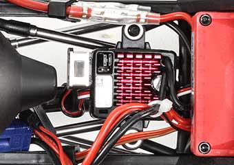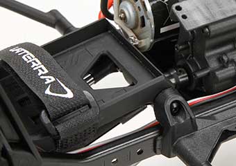 The battery tray floats over the front axle and is designed to accept 96mm shorty packs. Placing the weight of the battery over the front axle gives the front tires extra traction when crawling over rocks and tackling steep inclines.