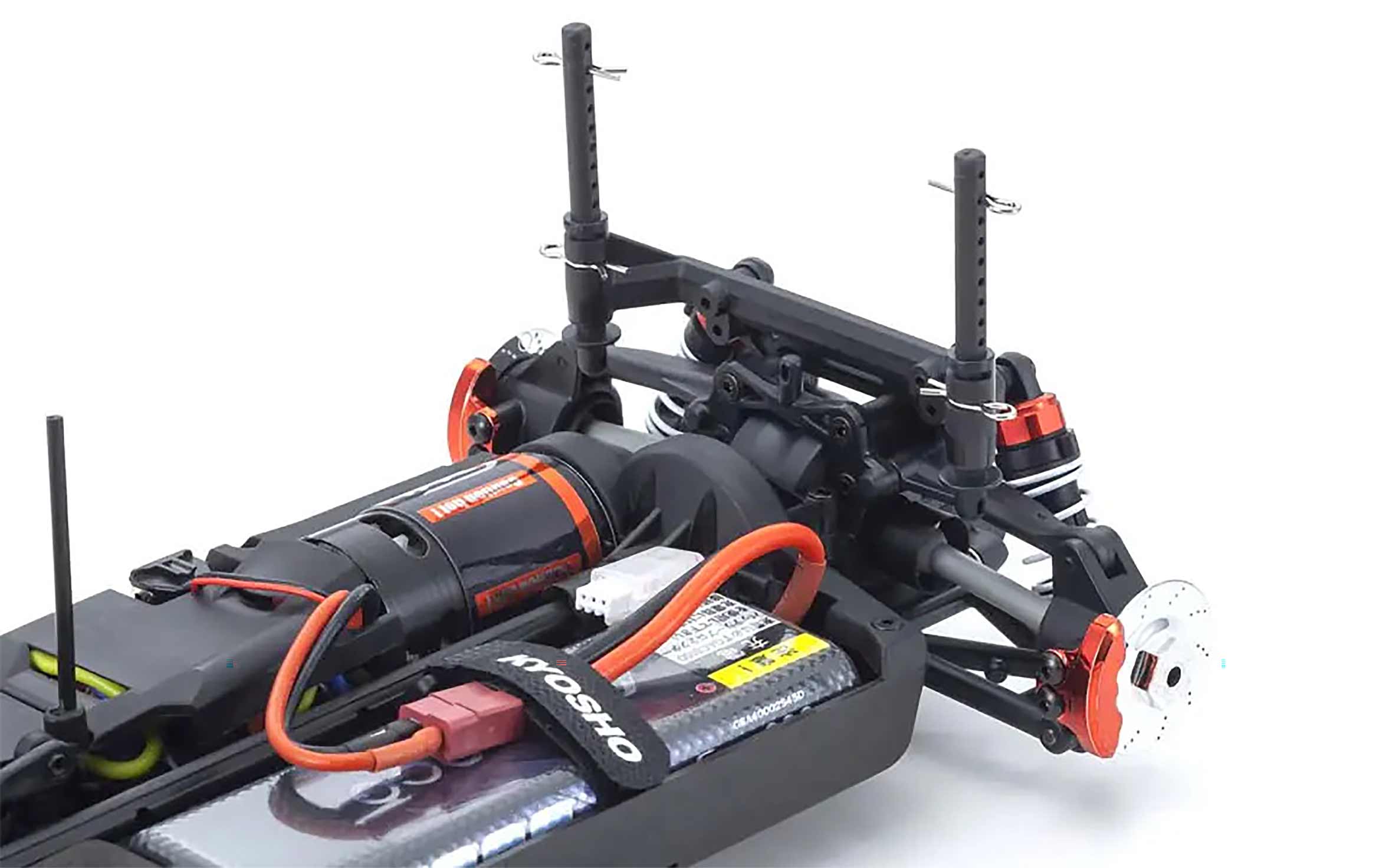 For the pure enjoyment of R/C car driving, the combination of a beautifully reproduced car body with the FAZER series Mk.II chassis can’t be beaten. Kyosho has taken its standard touring car chassis and given it a full model makeover that has evolved performance to a new level. A simplified design with fewer parts has improved maintenance efficiency and reduced weight while core strength and rigidity has been increased through new materials and ribbing and stiffeners on front and rear. In addition, the symmetrical chassis design synergizes excellent front-rear balance through the suspension with responsive control, irrespective of power source. Featuring front and rear gear differentials, oil shocks and full ball bearing specs, the high durability and impact resistance allows drivers to unleash the full potential of the chassis. Brake disc wheel hubs with two different offsets (0mm, +5mm) provide compatibility with 190mm and 200mm width body styles and allows the wheelbase to be adjusted to 274mm by replacing some parts (sold separately) for compatibility with other 1/10 scale body styles, in addition the body included. The Readyset package comes fully assembled and includes everything except charger and battery for the chassis, and batteries for the transmitter.