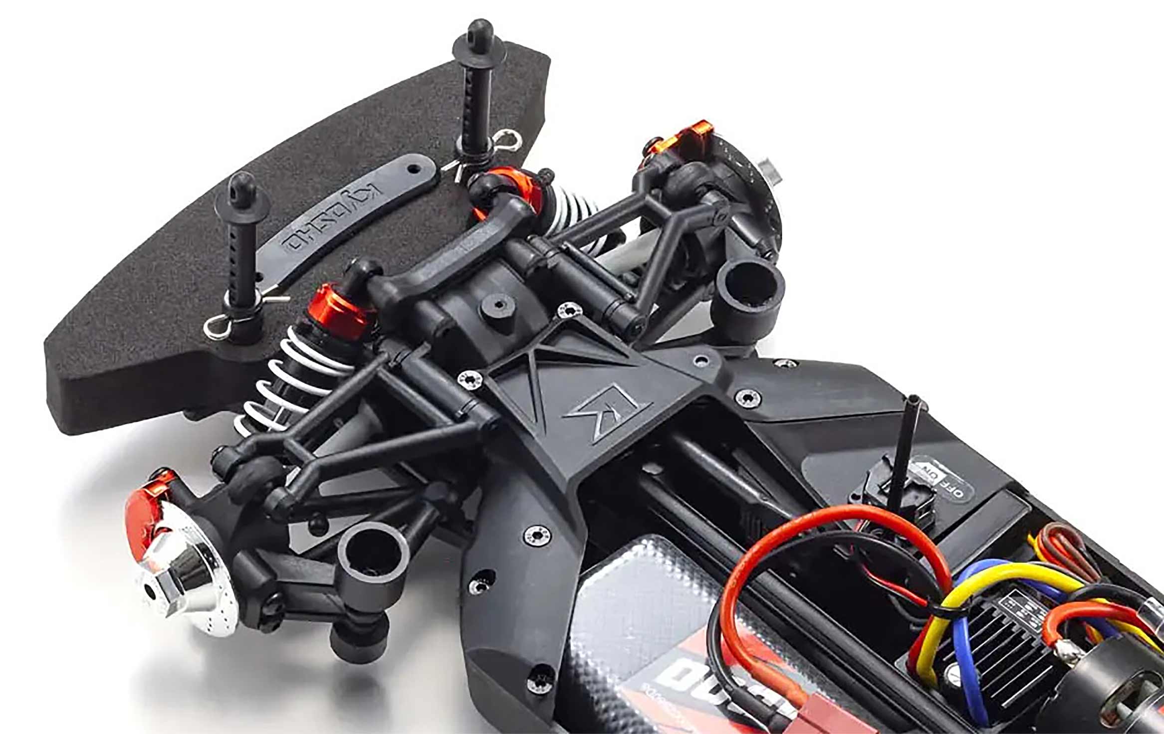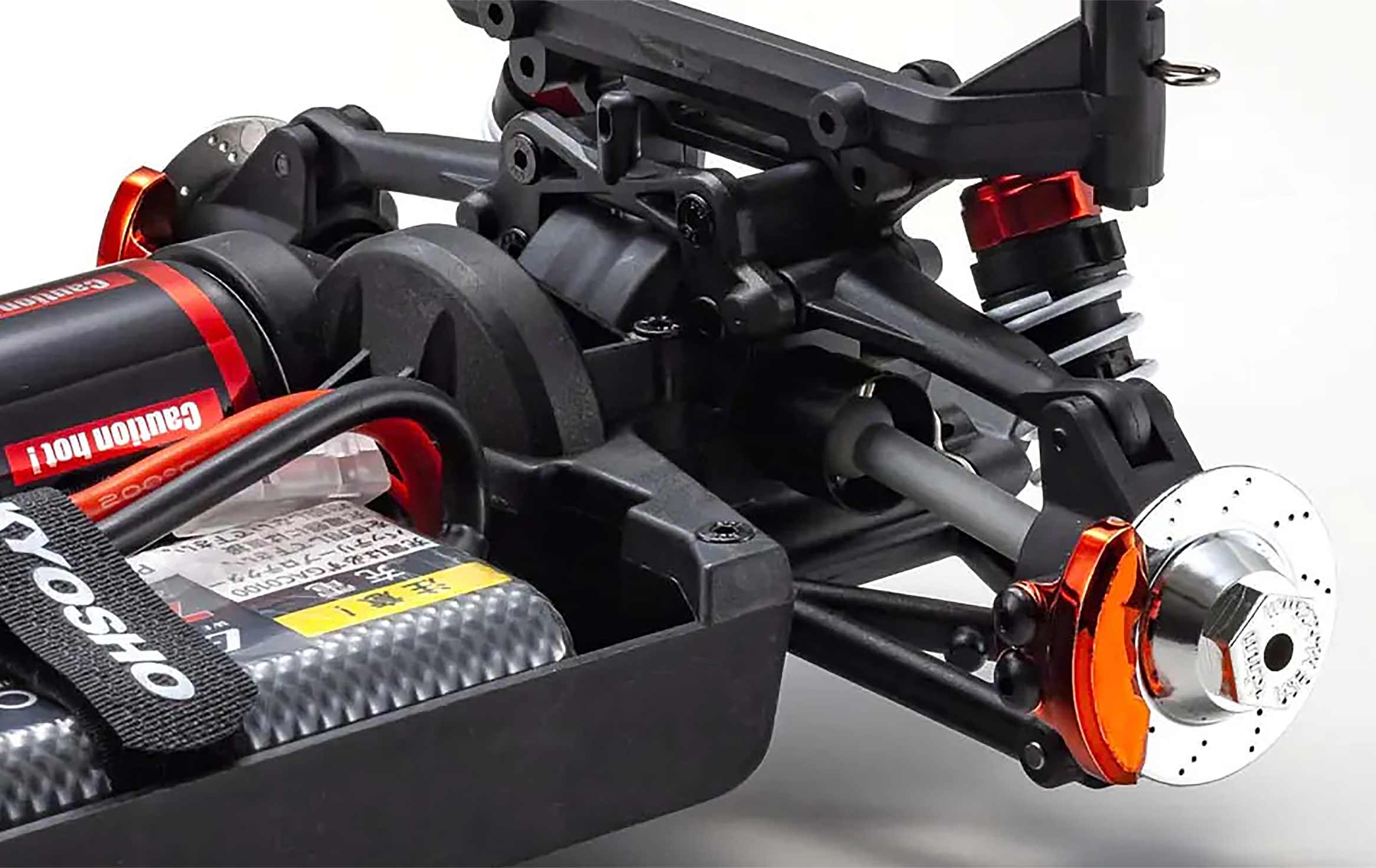 For the pure enjoyment of R/C car driving, the combination of a beautifully reproduced car body with the FAZER series chassis can’t be beaten. Kyosho has taken its standard touring car chassis and given it a full model makeover that has evolved performance to a new level. A simplified design with fewer parts has improved maintenance efficiency and reduced weight while core strength and rigidity has been increased through new materials and ribbing and stiffeners on front and rear. In addition, the symmetrical chassis design synergizes excellent front-rear balance through the suspension with responsive control, irrespective of power source. Featuring slipper clutch, front & rear gear differentials, oil shocks and full ball bearing specs, the high durability and impact resistance allows drivers to unleash the full potential of the chassis. Brake disc wheel hubs with two different offsets (0mm, +5mm) provide compatibility with 190mm and 200mm width body styles and allows the wheelbase to be adjusted to 274mm by replacing some parts (sold separately) for compatibility with other 1/10 scale body styles, in addition the body included. The Readyset package comes fully assembled and includes everything except charger and battery for the chassis, and batteries for the transmitter.