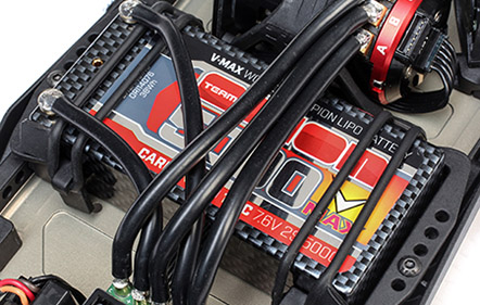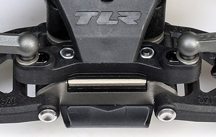 The 22 5.0 boasts the most versatile and easiest to use battery hold down system. The battery cradles key into the mud guards for five fixed, and easy to replicate, battery positions. The battery is then held down with elastomer straps on each end that can stretch to fit any height shorty battery and any weight plates under it. Best of all, the battery is out in no time flat and back in just as easily.
