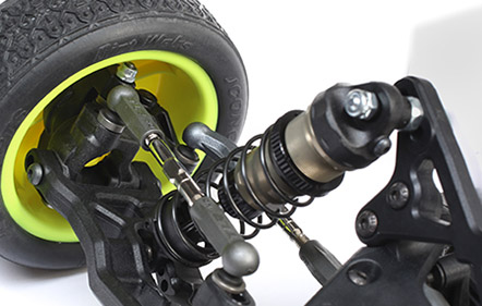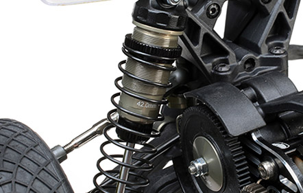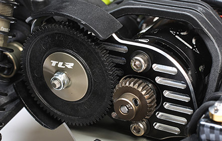 Included is TLR's innovative and maximized Direct Drive System (DDS) with an ultra-light and short layshaft, aluminum spur gear hubs, and a 72T molded spur gear. By eliminating the slipper assembly, several grams of rotating mass are removed, and there is no power lost with the motor driving the spur but not the transmission. You will feel the extra snap and torque when exiting turns and accelerating over hard to clear jumps.