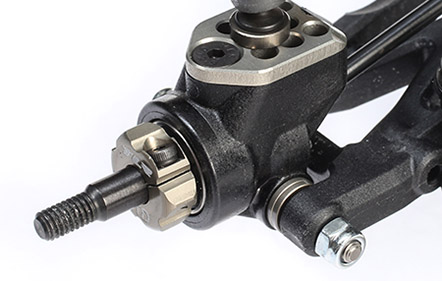 The molded-composite hub base allows a bearing to be press fit without play and minimal un-sprung weight. An aluminum plate is secured to the hub with an M3 screw and ball stud which is vertically adjustable. Now the ball stud is supported by aluminum from pushing or pulling out, while still threading into composite so it won’t work loose.