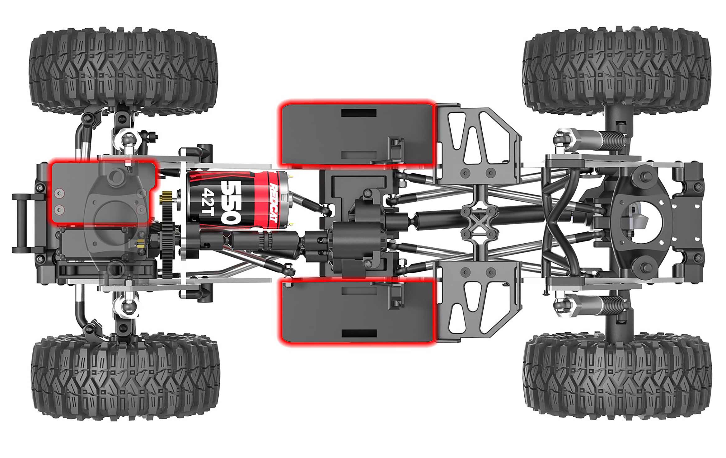 Under the hood, you'll find innovation and durability at their best. The forward-mounted motor, strategically positioned low, ensures optimal rock climbing performance. Meanwhile, the centrally mounted divorced transfer case boasts a quick-change system for effortless gear ratio adjustments, enhancing off-road capabilities.