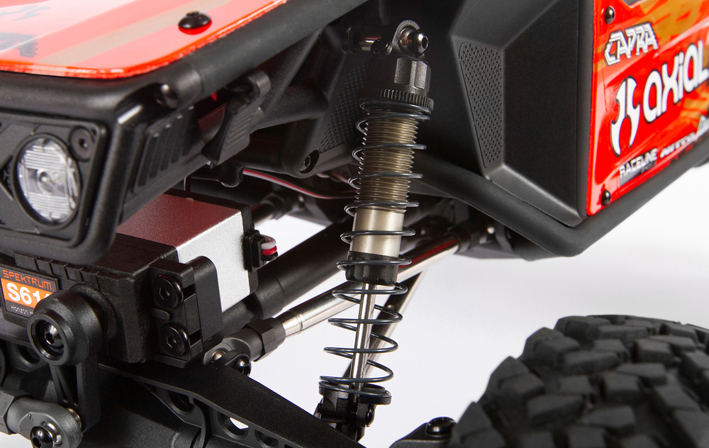 • Adjustable oil-filled shocks feature hard anodized, threaded shock bodies and a single coilover spring.