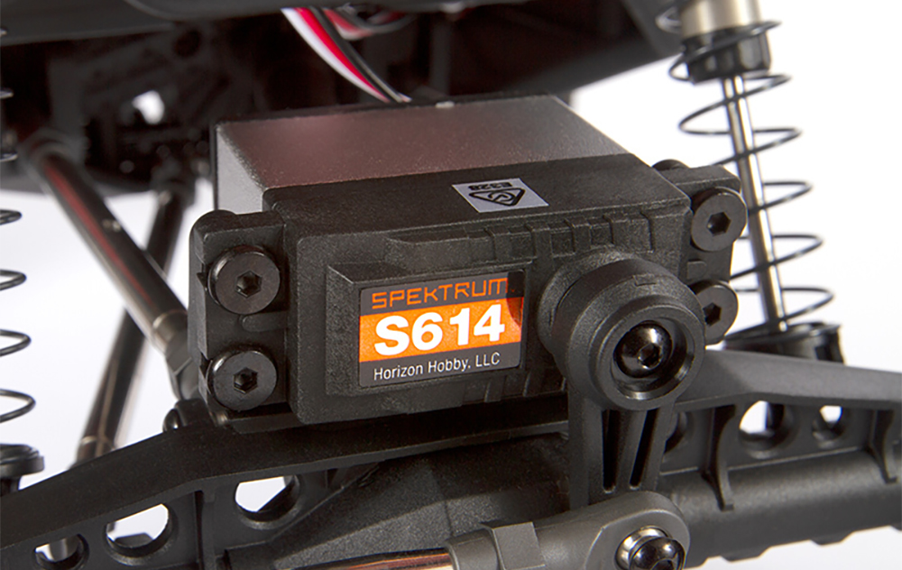 The Spektrum S614 metal geared servo offers 201 oz-in of steering torque, a metal case for strength, and it’s waterproof for extra protection against the elements. The axle-mounted servo allows better steering control in full articulation.
