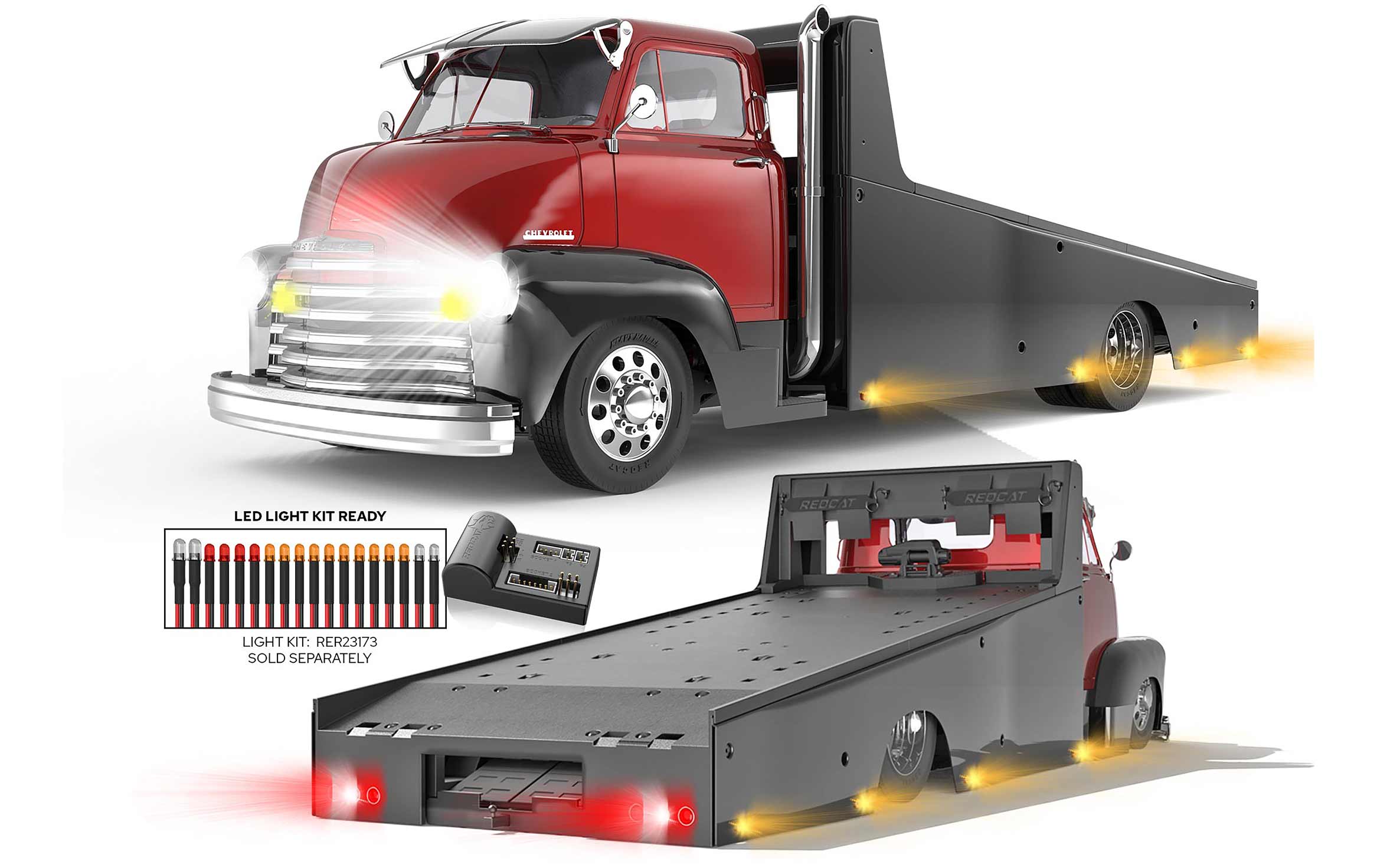 Designed to carry 1/10th scale RC vehicles, this custom hauler is not only visually striking but also incredibly functional. It's LED-ready, with the capability to accommodate up to 18 LED lights for enhanced realism (LED lights sold separately).