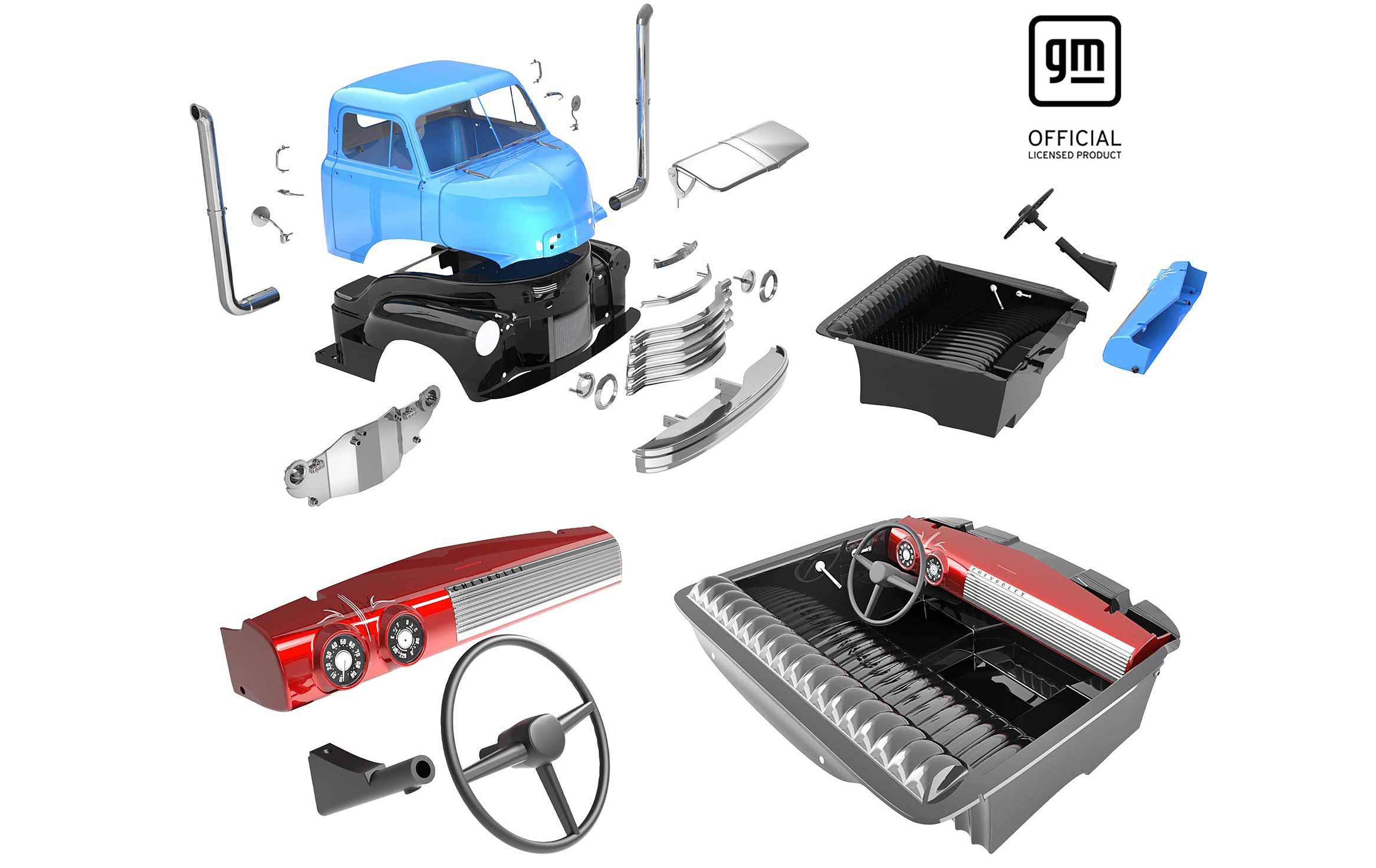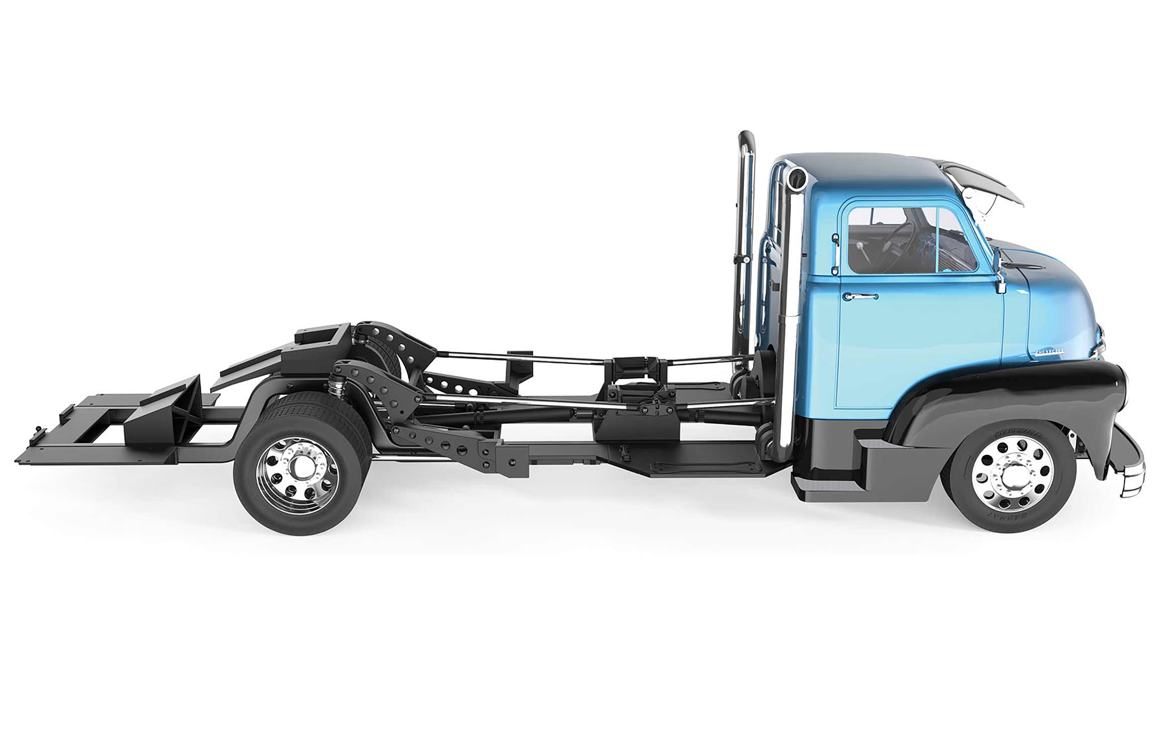The meticulously crafted officially licensed 1953 Chevrolet "COE" body boasts a two-tone paint finish adorned with just the right touch of chrome accents, while the interior showcases exquisite detailing, including a color-matched and painted dashboard.