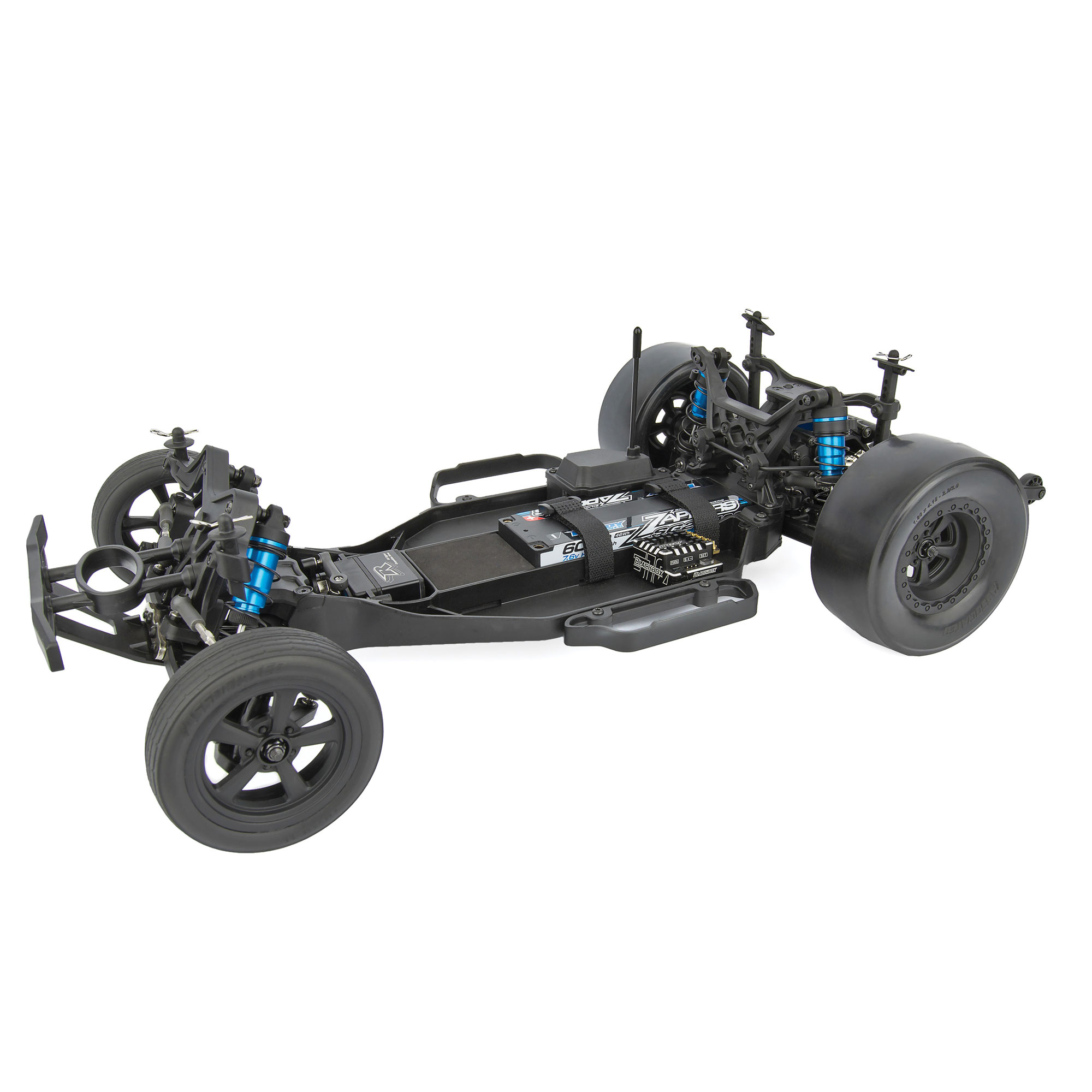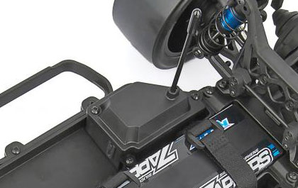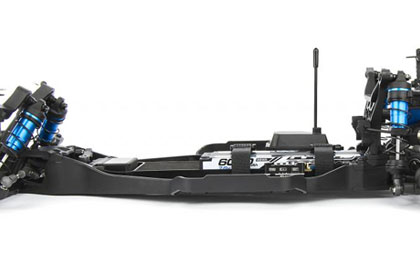 Low center-of-gravity molded composite chassis with hook-and-loop battery straps that accommodate for both NiMh and 2/3s LiPo battery packs
