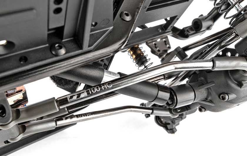 Enduro has updated the Builder’s Kit yet again by including our GKS™ shock towers in front and rear. The shock mount inserts provide the ability to adjust shock angle, droop, and vehicle ride height without affecting spring preload. Matched up with the shock mount inserts are our race-proven ultra-smooth Factory Team bronze shocks with black plastic bleeder caps and collars–perfect for traversing rough terrain. Along with the updated shock towers, we’ve included the GKS aluminum track bar mount that is bolted directly to the frame rails. This makes the front suspension more rigid and flex-free with a more precise steering feel. Also included are updated Factory Team 12.3 and 12.8-inch wheelbase high-clearance links with black nitrate finish and durable Factory Team steel pivot balls for smooth articulation.