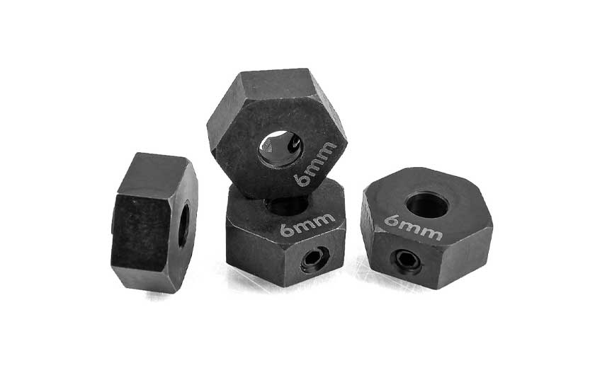 Steel wheel hexes (12x6mm) add weight down low and provides a strong solid mount for your favorite plastic ot aluminum wheels.