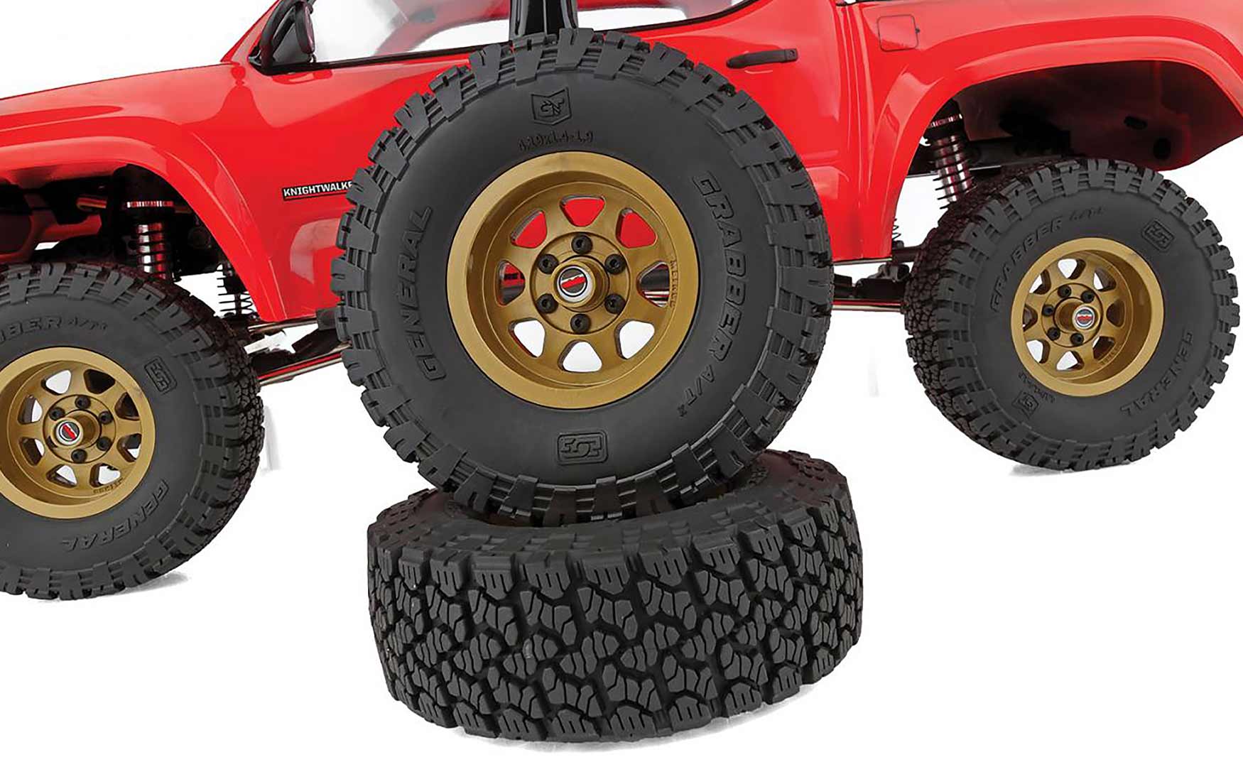 Gripping the trail is a set of officially licensed General Grabber A/T X tires molded in a high-performance, soft compound rubber. The General Grabber A/T X tires are mounted on Method 701 Trail Series beadlock wheels. No more worrying if your RTR tires will come unglued.