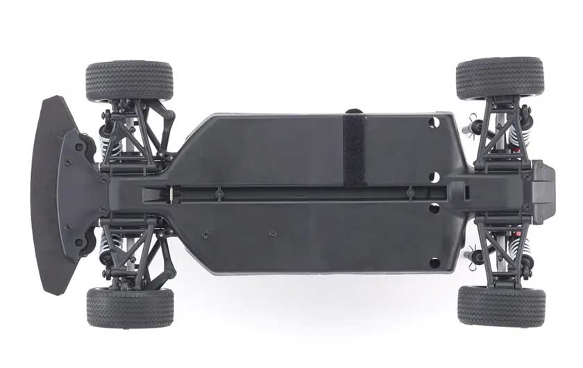 Chassis realizes low center of gravity with its simple, functional design. Featuring an integrated gearbox that optimizes torsional rigidity of the main chassis, the nylon material reduces weight while improving impact resistance. Each key component has been reinforced in this simple design without upper deck.