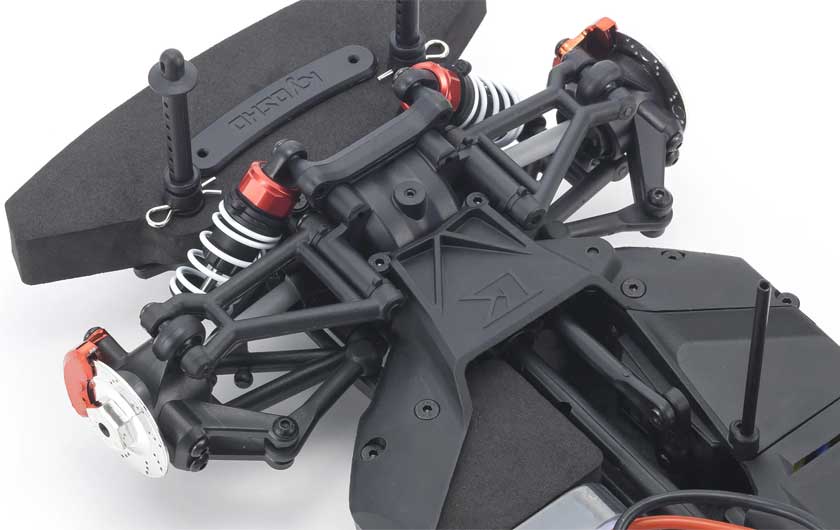 For the pure enjoyment of R/C car driving, the combination of a beautifully reproduced car body with the FAZER series chassis can’t be beaten. Kyosho has taken its standard touring car chassis and given it a full model makeover that has evolved performance to a new level. A simplified design with fewer parts has improved maintenance efficiency and reduced weight while core strength and rigidity has been increased through new materials with ribbing and stiffeners on front and rear. In addition, the symmetrical chassis design synergizes excellent front-rear balance through the suspension with responsive control, irrespective of power source. Featuring front and rear gear differentials, oil shocks and full ball bearing specs, the high durability and impact resistance allows drivers to unleash the full potential of the chassis. Brake disc wheel hubs with two different offsets (0mm, +5mm) provide compatibility with 190mm and 200mm width body styles and allows the wheelbase to be adjusted to 260mm by replacing some parts (sold separately) for compatibility with other 1/10 scale body styles, in addition to the included body. The Readyset package comes fully assembled and includes everything except charger and battery for the chassis, and batteries for the transmitter.