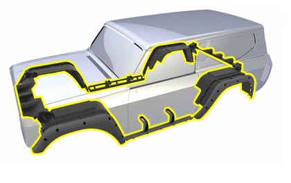 • Licensed International Harvester Scout II body, Hard plastic grill, LED ready body and bumpers, Plastic folding mirrors, Molded inner and outer fenders,