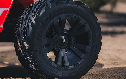 The body has the same aggressive styling as that of the KRATON™ 6S BLX, with a smaller version of its rear wing. There are also many subtle tweaks that give the KRATON™ 4X4 4S BLX a personality all its own. Large, tough wheels hubs and durable 17mm wheel hexes hold standard 3.8" wheels, outfitted with low-profile MINOKAWA LP tires.