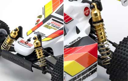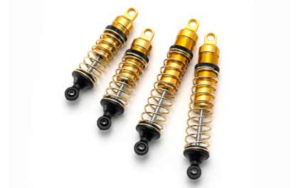 Equipped with gold anodized oil shocks that resemble the pressure shocks that dominated the era. Threaded shock bodies with dial adjustment collars allow for easy ride height tuning for precision chassis setting.