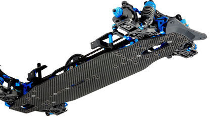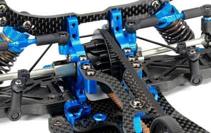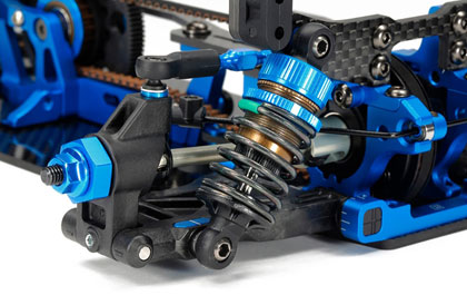 4-wheel independent double wishbone suspension from the TRF420. Damper stays are designed to allow some flex, for high traction and a boost to drivability.