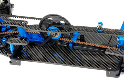 The drivetrain features the spur gear positioned toward the chassis center for stable drivability. (The motor position is not changed from the TRF420.) Front and rear drive belts are based on the TA08 PRO chassis kit (Item 58693).