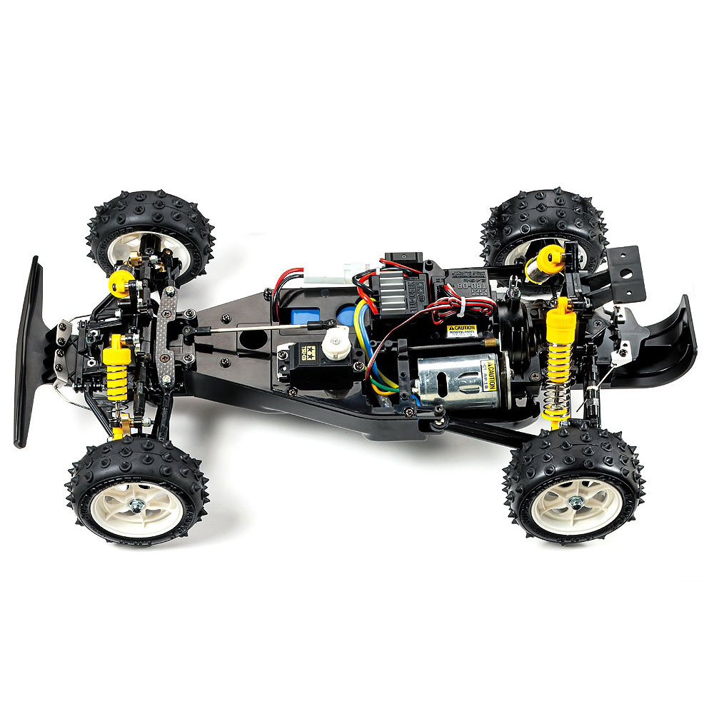 This R/C model assembly kit is an updated re-release version of a 1988 buggy from the Tamiya back catalog, which inherited its make-up from the legendary race-oriented Avante. The forward cockpit body design - and the rear wing - are molded in lightweight polycarbonate and pre-painted black, pre-cut with body mount holes pre-made to save on some preparation work. An ABS plastic monocoque frame is employed, with responsive shaft-driven 4WD plus a triple differential setup, four-wheel double wishbone suspension and plenty more - superb off-road driving awaits!