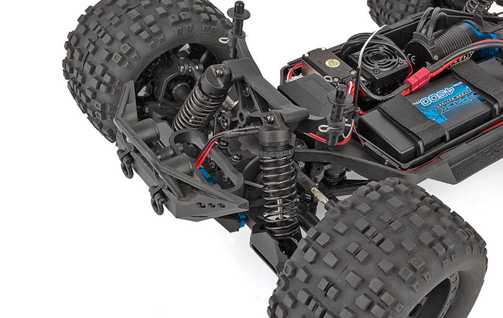 The RIVAL MT10 is a powerful, purposeful, and built-to-last 1:10 scale monster truck capable of running on 3s LiPo battery. Its strength lies at the very core of this beast with its high-performance 3300kv Reedy brushless motor, fully sealed transmission, robust shaft drive, and center differential.
