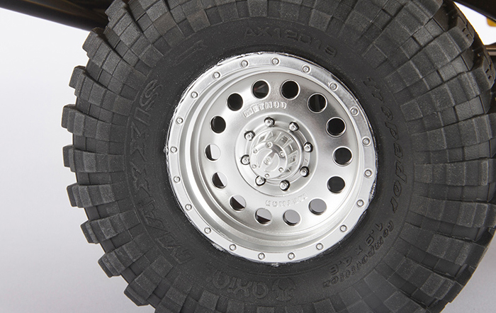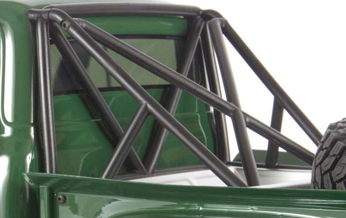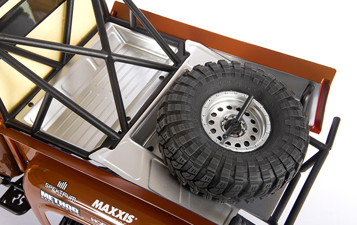 By creating the bed from four pieces instead of as one, Axial® engineers have given it much greater depth. The inner bed panels have the appearance of bead rolled aluminum sheet metal, just like the real thing. Also included is a functional spare wheel and tire. For a more “truggy” look, the rear fenders can be removed.