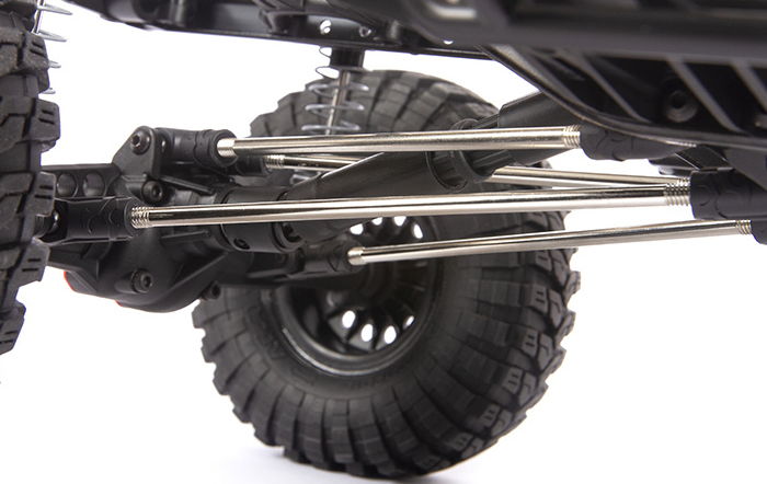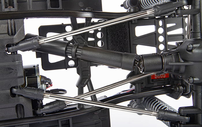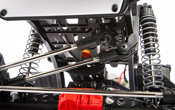 Just as a full-size truck has its steering box located on the frame, Axial® places the servo mounting location on the chassis. The front suspension provides the correct steering geometry with virtually no bump steer.