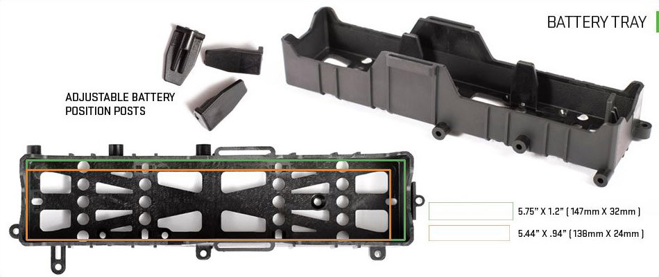 • Adjustable battery tray accommodates batteries up to 32 x 44 x 147mm (3S 5000mAh) while improving weight distribution and center of gravity.