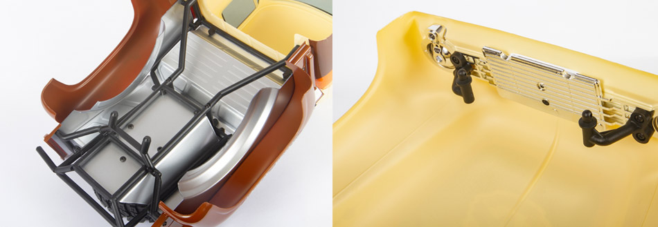 The hinged body system puts on-board components in easy reach. You can access the battery and chassis by simply removing two body clips and swinging the body up.