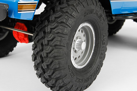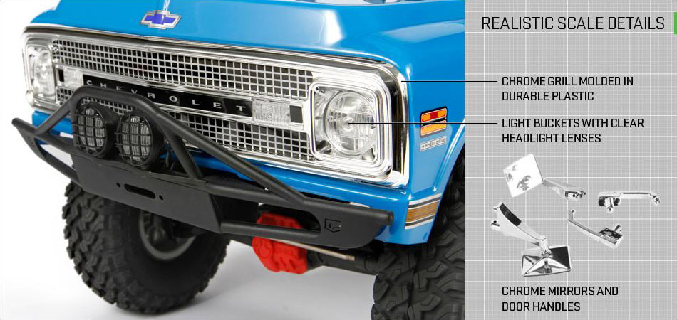 To keep the Blazer rolling along in even the toughest situations, we’ve mounted it on our rugged SCX10™ II chassis. High-clearance AR44 high-pinion axles, a chassis mounted servo (CMS), re-designed AX10™ transmission case and tough steel suspension links are just a few of the parts that make the Blazer a beast on any terrain.