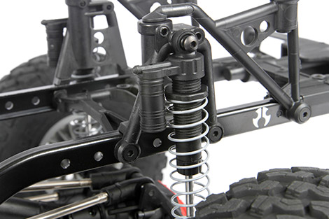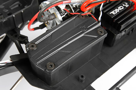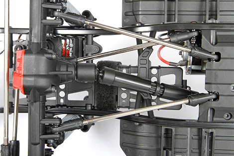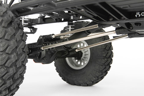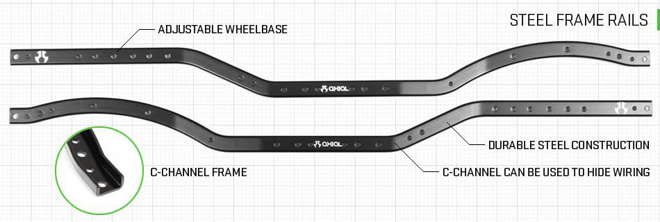 The realistic high strength c-channel chassis frame is made of durable steel with cross bracing for reinforcement and is held together with all hex hardware. Realistic looking frame and cross braces improve chassis rigidity (torsional stiffness). Realistic shock hoops with multiple shock mounting positions allows you to adjust your suspension for maximum performance. The simplified design makes maintenance and assembly quick and easy. The contoured skid plate significantly reduces hang-ups on terrain. Compared to the previous design, additional holes have been added to the rear portion of the frame rails for making wheelbase adjustments.
