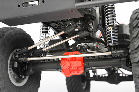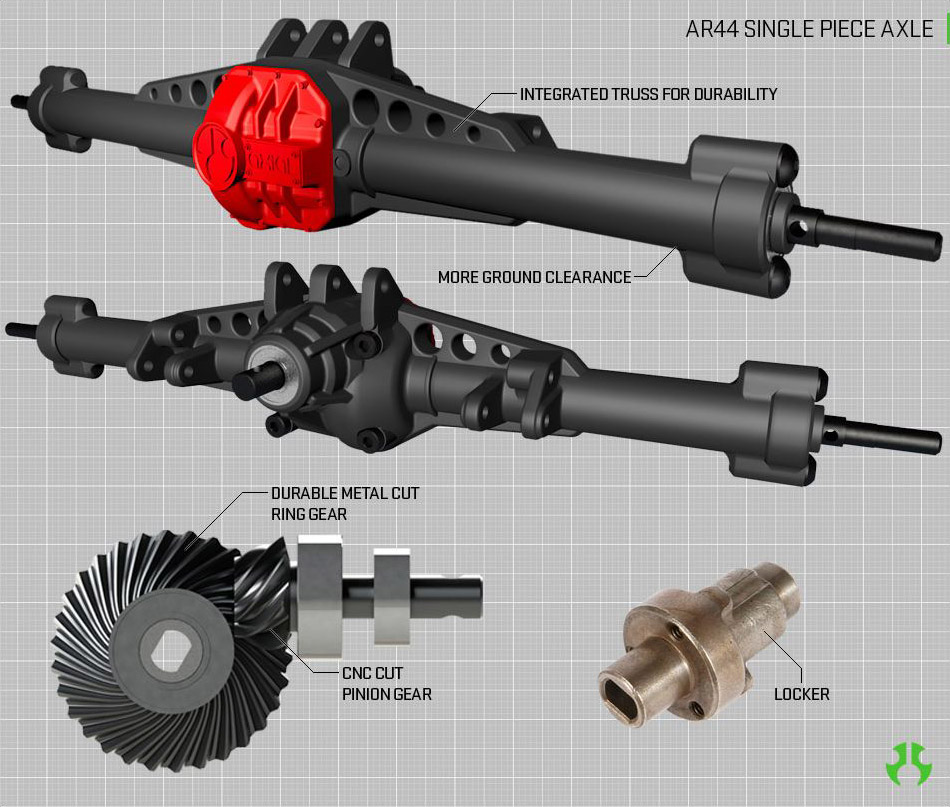 The pinion gear is 6mm above center, this allows for added ground clearance and better driveshaft angles. The high pinion design has an increased surface contact for increased durability. AR44 front and rear axles feature a single-piece design with molded truss for extreme durability. Integrated C-hubs and lockouts offer optimized performance as well as improved ground clearance. Helical, metal cut internal gears, and high-quality bearings are all standard equipment.