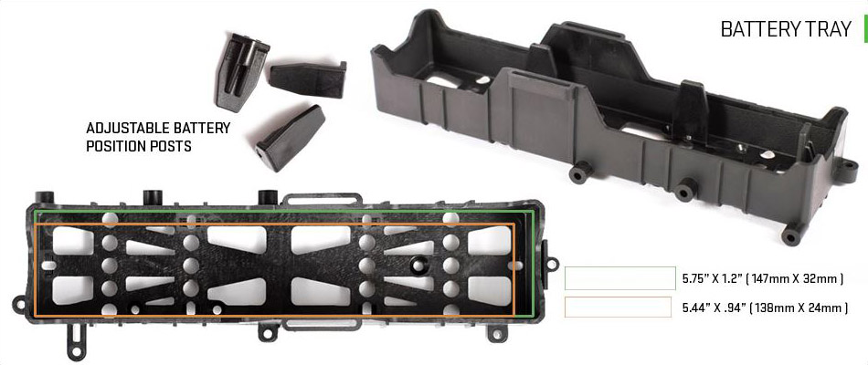 The new adjustable battery tray is now relocated lower and further forward for better weight distribution and center of gravity (COG).