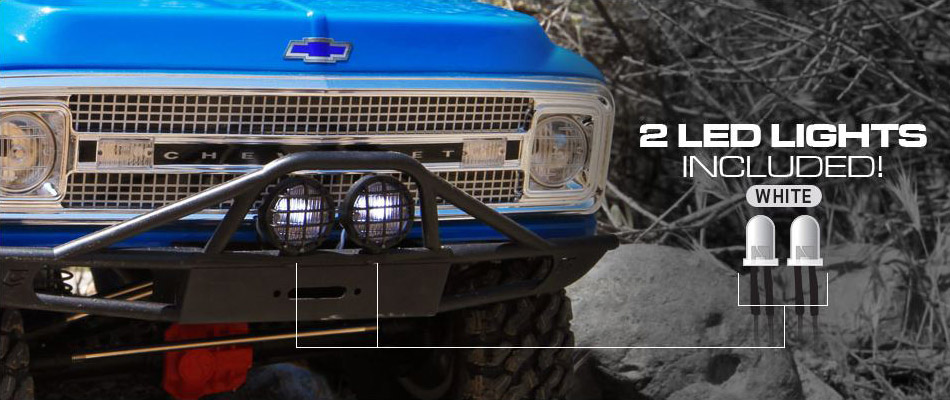 But this Blazer sports more than just a macho look. Additional items like chrome-coated grille, mirrors and door handles are included. Officially licensed Chassis Unlimited front and rear tube bumpers are mounted tight to the body for maximum clearance and a set of offroad light (with LEDs) shine some light when the action goes dark.