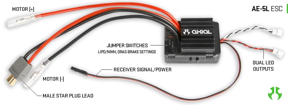 The Axial AE-5L ESC is 3S LiPo capable yet easily switched “in the field” between LiPo and NiMh battery types with a simple jumper – no more complex procedures.
