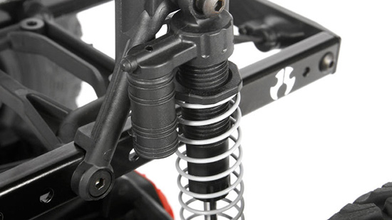Threaded shock bodies hold a single coilover spring and they're oil filled shocks which allow you to tune the dampening rate. Realistic shock hoops with multiple shock mounting positions allows you to adjust your suspension for maximum performance. There's also coilover shock reservoirs for realistic scale looks.