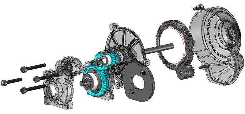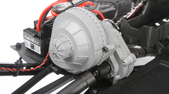 The ultra compact transmission allows for a wide range of gearing choices. The overall ratio can be adjusted using different pinion and spur gear choices allowing super high speed or competition level crawling speed. The new transmission housing design still retains the basic function of the original transmission but in a new more scale looking case.