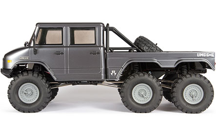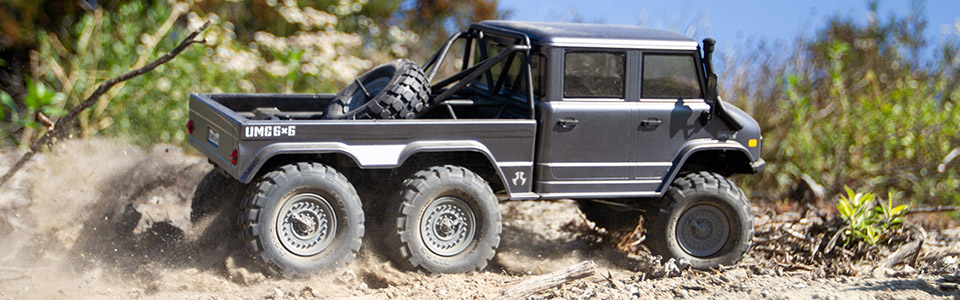 For extreme off-roading with more "Get me out of here!" grip, six wheels are better than four. See what new territory you can explore with the 1/10 scale Axial® UMG10™ 6X6 RTR. Built around the proven SCX10™ II chassis, the UMG10™ 6X6 delivers class-leading RC crawler performance in a convenient, ready-to-run package — only a battery and charger are required. The military-style body captures the look of full-size 6X6 trucks, with scale features that include 1.9 military-spec wheels and tires, a working spare, and built-in mounting positions for front and rear LED lights. The performance on dirt and gravel trails does thrilling justice to the vehicle's full-scale, all-terrain inspiration. Waterproof electronics keep the action alive over snow, mud, and more. With its durable SCX10 II metal-geared transmission, rugged AR44™ axles, full ball bearings, and more, the Axial® SCX10 II UMG10™ 6X6 lets even first-time RC drivers keep on going when the going gets tough!