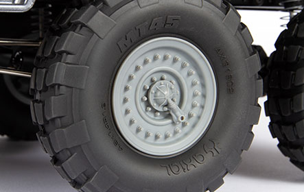 Six 1.9 MT45 tires, molded in sticky Axial® S30 compound rubber, keep the UMG10™ 6X6 crawler on course and climbing difficult terrain with ease. Their big block, symmetrical tread pattern provides plenty of grip to get over steep obstacles. The tires are mounted on injection-molded, 3-piece, MW19 beadlock wheels that offer the perfect scale look for a military build. A functional spare tire is also included.