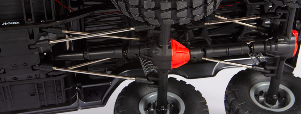 The AR44™ axles feature a high pinion gear set for a much lower gear ratio than most vehicles, plus a smaller pumpkin and added strength. The gear set overcomes the torque twist often associated with smaller gear sets. The axle itself retains the durability associated with the SCX10, despite being delivered in a smaller axle housing