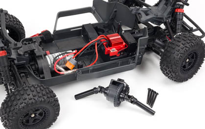 The best short course RC truck for first-time bashing through amplified all-road blasting is the ARRMA SENTON 4X4 MEGA 550 RTR. Though easy to drive, affordably priced, and ready-to-run — even a 7C NiMH battery and USB charger are included — its aggressive 1/10 scale styling hints at high-speed excitement that’s ahead. Speeds of 30+ mph are achievable under optimum conditions. From its full-time 4WD transmission to the large diff gears, every part of the ARRMA SENTON 4X4 MEGA 550 has been engineered by the ARRMA design team of RC enthusiasts to survive brutal blasting. The remote control short course truck’s smooth handling has you looking like a winner right off the starting line, and its wide wheelbase and vented tires let you put the hammer down on nearly any off-road or paved surface. An innovative modular chassis simplifies maintenance and repairs, cutting down time to the bone. The included Spektrum radio lets you limit top speeds to 50% or 75% of full throttle until you’re ready for it all, and its ergonomic grip fits your hand like a glove. ARRMA includes a high capacity NiMH battery. You can also upgrade easily to 2S LiPo power to take your RC 4x4 fun to the next level. Fully assembled and ready-to-run, the ARRMA SENTON 4X4 MEGA 550 Brushed RTR needs nothing more than four AA batteries before you’re ready to make your move!
