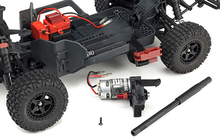 The SENTON™ 4X4 MEGA RTR Short Course Truck's ingenious modular design makes chassis components easy to access for maintenance. Its power module consists of a MEGA 550 motor, motor plate, slipper clutch assembly and gear cover. The power module can be detached from the chassis, as a complete unit, by removing just one screw. With the power module removed, the slipper clutch can be reached easily for adjustments by taking out three screws that attach the gear cover. The power module design also ensures that pinion and spur gear mesh is perfect every time, using numbered holes for different pinion gear sizes.