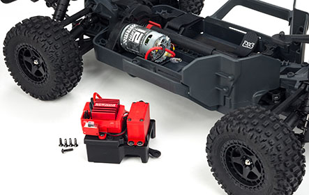A two-piece molding screwed to the truck's chassis serves as its electronics module, containing a waterproof radio box, servo mount, and ESC tray. The radio receiver mounts inside the radio box for protection from dirt and moisture. The ultra-compact ESC is screwed to the top of the module, allowing quick access to the on/off switch, while the servo mounts to the side. All three components can be removed together, quickly and easily.