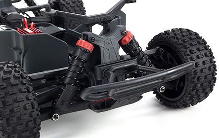 The self-bleeding, oil-filled shocks use a tried and tested, coil-over design for simple maintenance and amazing handling. Their innovative rod end has a molded-in spring perch for extra toughness. High chassis guards limit the amount of dirt and debris that can get into the chassis tub. Side impact nerf bars further protect the chassis and body shell, and shock-absorbing loops keep the front and rear bumpers secured to the chassis, offering defense against heavy impacts.