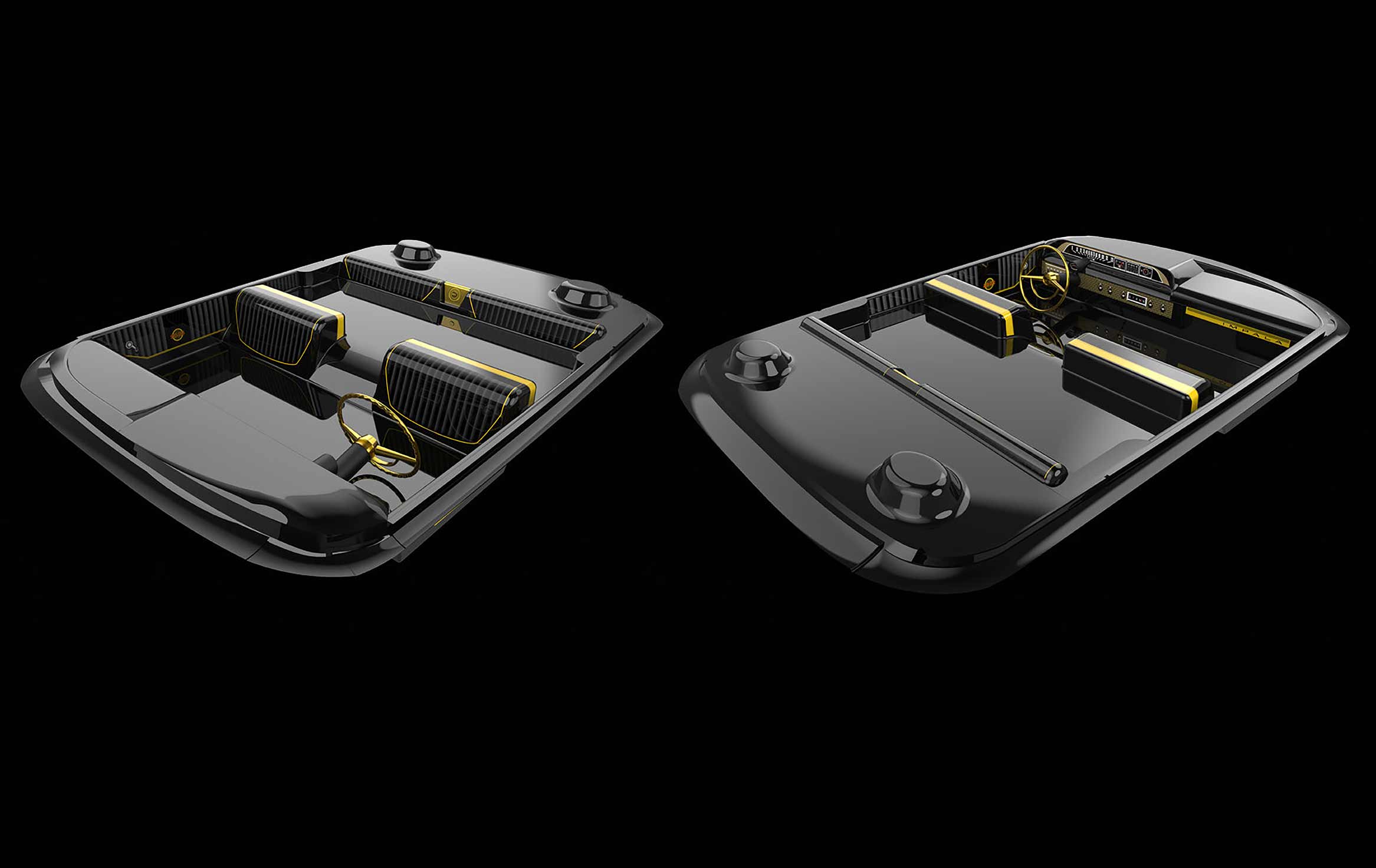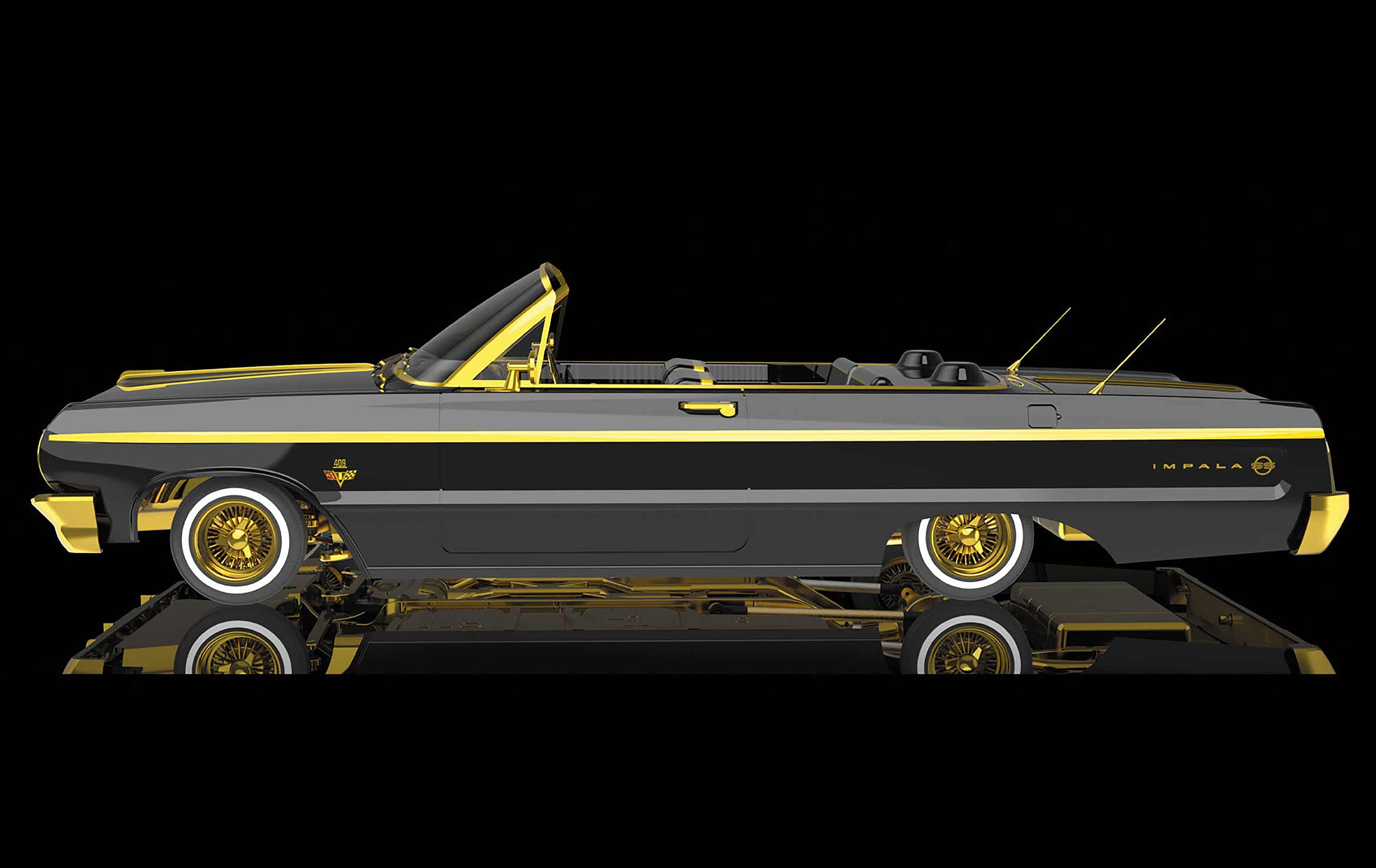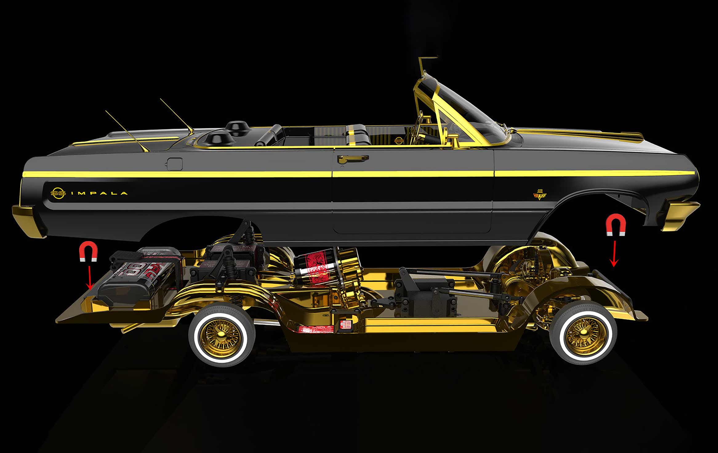 Beneath the stunning exterior, the Gold Digger is decked out with many upgraded, aftermarket gold parts, such as a gold chassis, frame rails, steering tray, steering rack, steering arms, toe links, suspension arms, steering wheel, front lifting bellcranks, trunk pan, exhaust, transmission case, gear cover, rear axle housing assembly, center drive shaft, officially licensed Dayton wheels and included magnetic body mounting system. The SixtyFour is built for slow cruising and performing tricks that can only be achieved with a specially designed suspension. Using specialty servos and precision weight bias, it replicates the driving style and overall look of a full sized lowrider / hopper.
