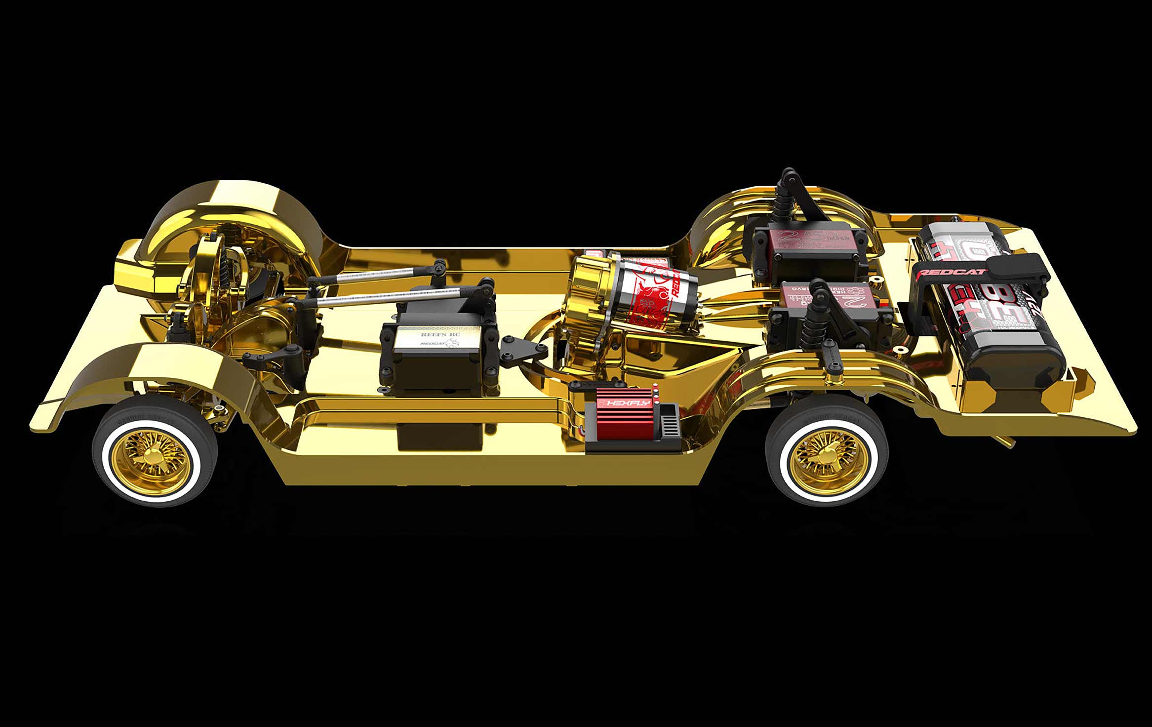 This particular special edition Sixtyfour, the Gold Digger, is perhaps the most lavish variant of our fully functional hopping lowriders yet with its eye-catching black body, plethora of gold accents and stunning special edition decal sheet. As with all Redcat SixtyFour vehicles, it still dazzles the crowd with its breathtaking design, patented front suspension hopping system and authentic lowrider performance.