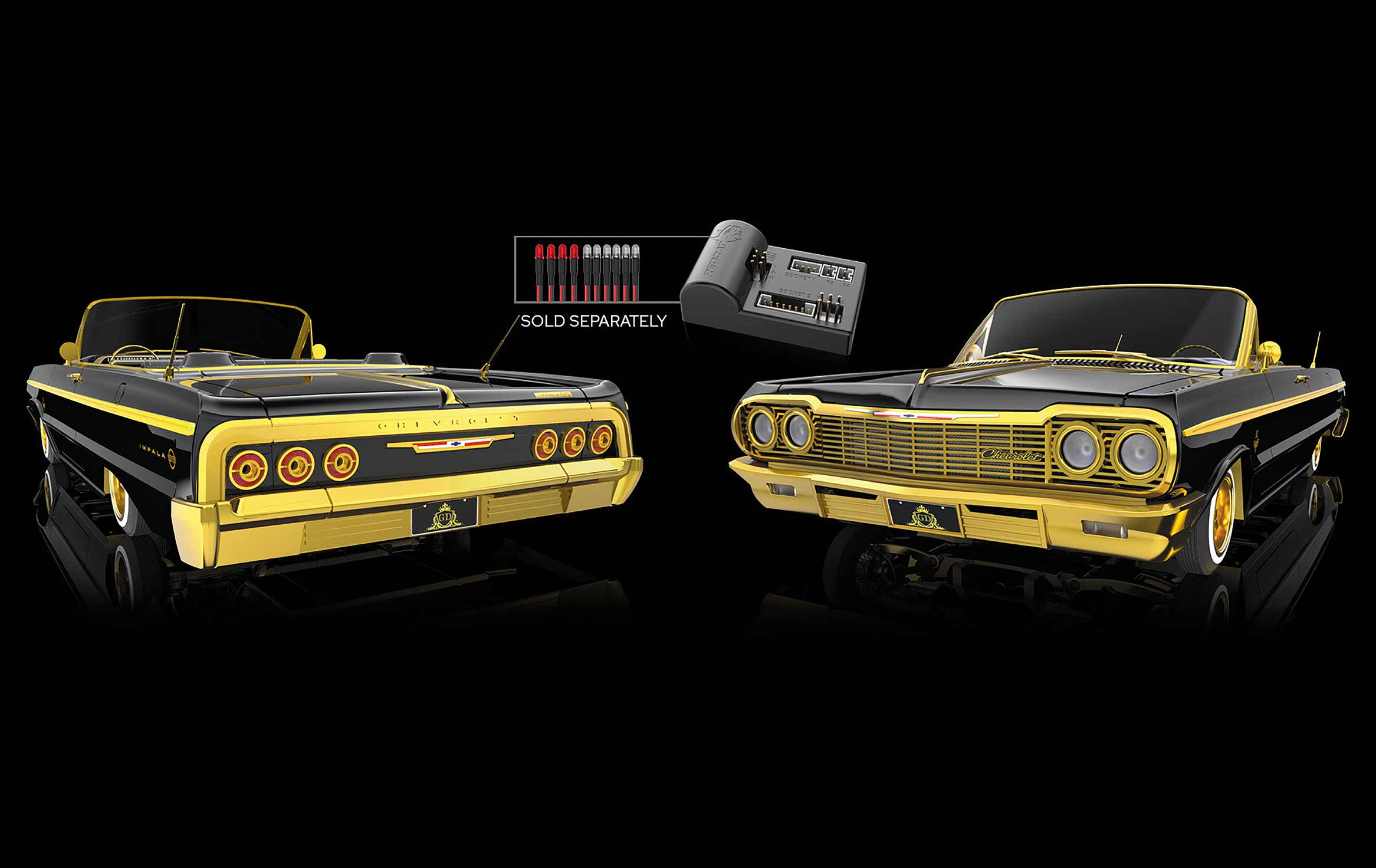 The SixtyFour lowrider, upon which the Gold Digger is based, meticulously captures the essence of the classic 1964 Chevrolet Impala SS. We’d designed the SixtyFour with unwavering attention to detail, staying true to the original vehicle's styling and the Gold Digger features a special black body trimmed with gold foil decals and gold color plated molded plastic parts. An optional livery decal set is included for added bling. Check out the optional LED light kit (sold separately) for night time cruising.