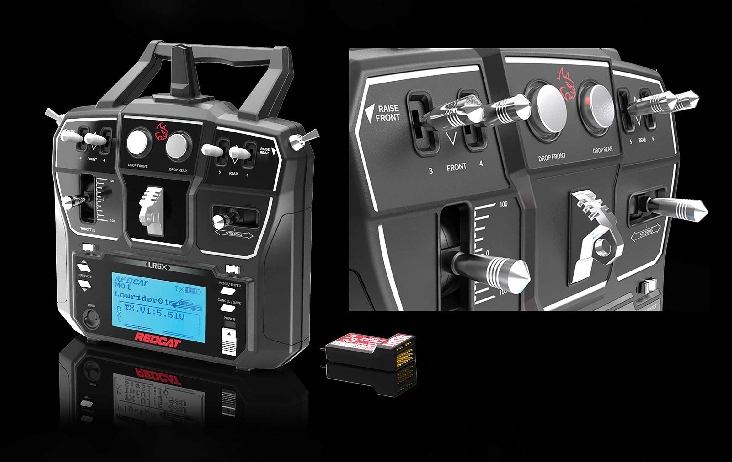 The SixtyFour is equipped with the LR6X six-channel 2.4GHz radio system, specially designed with lowrider-style switches for an authentic driving experience. Outfitted specifically for use with RC lowriders, this radio's buttons, levers, and switches allow the driver to perform realistic hopping and lowrider tricks, mirroring the controls of a full-sized hydraulically operated lowrider.