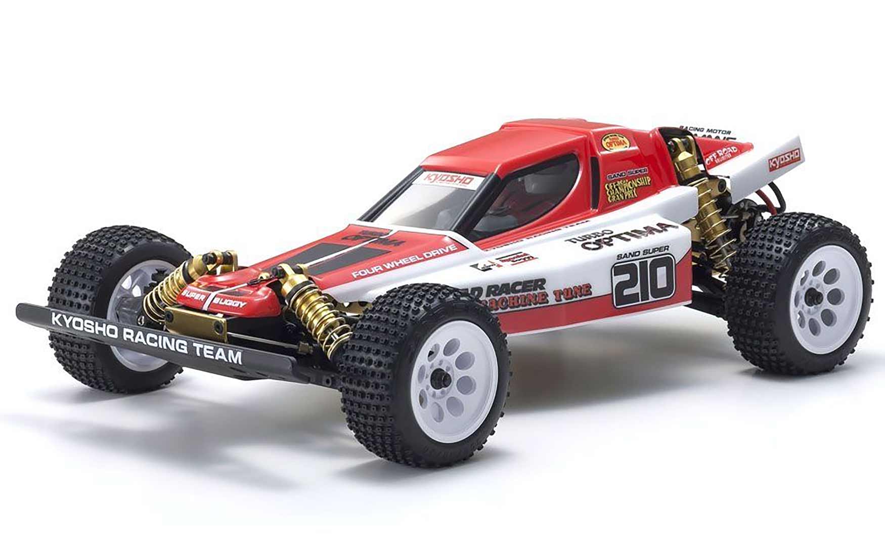 Until now. In addition to large diameter tires, large capacity pressure shocks, front and rear stabilizers and Le Mans 240S motor, the immortal Turbo Optima has modernized for 8.4V power and makes its debut as the 7th model of the vintage series. Key components of the Turbo Optima chassis have been redesigned to meet the demands of modern racing conditions and power sources, and share DNA with the Optima and Javelin. The new Turbo Optima is not simply a reproduction of the original and includes gold anodized parts that were optional upgrades on the original, gold shocks with dial adjustment of chassis height and new modern block pattern tires. Higher specs and design features deliver modern performance standards and visual impact that captures the magic of the original.